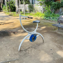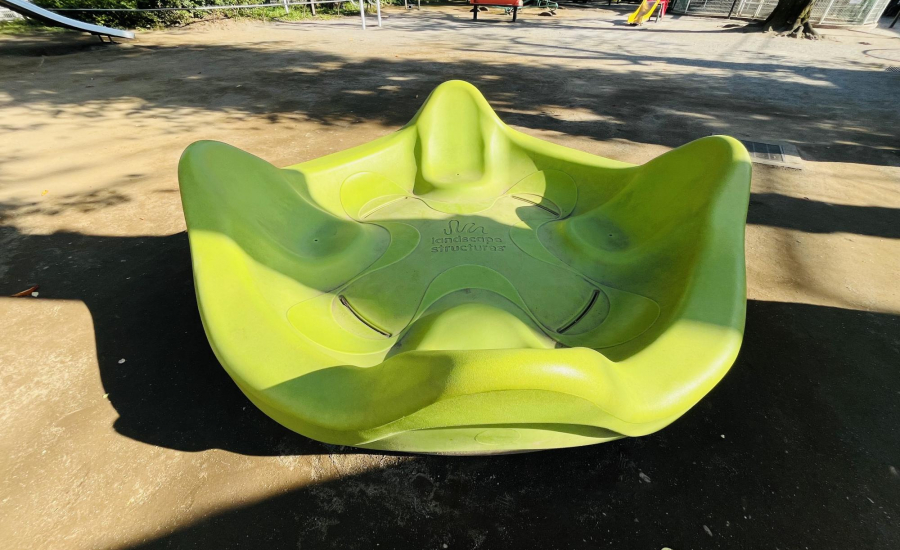園内には、緑色のユニークな形をしたスピナー型の遊具があります。中に入って座ったり寝転んだりしながら、体を少し傾けると回転し、ゆりかごのような優しい揺れを感じられますよ。バランスをとりながら遊ぶことで自然と体幹も鍛えられ、小さな子どもから大人まで楽しめる設計です。さらに、車椅子からでも乗り降りしやすいデザインになっており、どんな人にも遊びの輪が広がりますね。