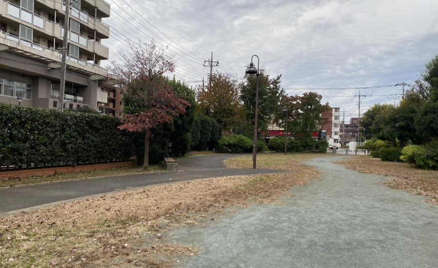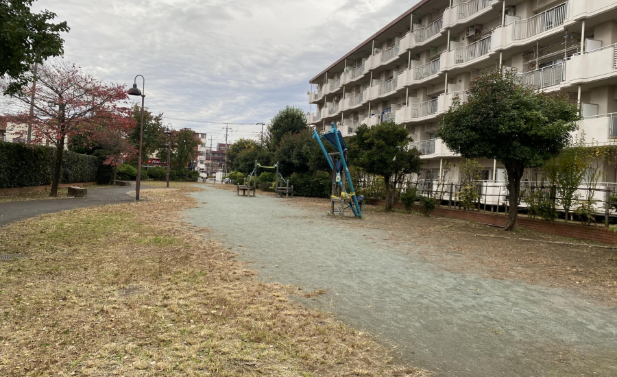 清瀬市の団地の側にある「竹丘ゆうゆう公園」は横に長い形が特徴の公園です。