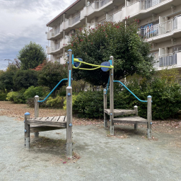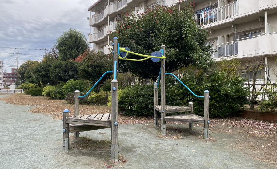 竹丘ゆうゆう公園には、うんていのような変わった形の遊具があります。子どもと一緒に遊び方を探してみるのもいいかもしれません。