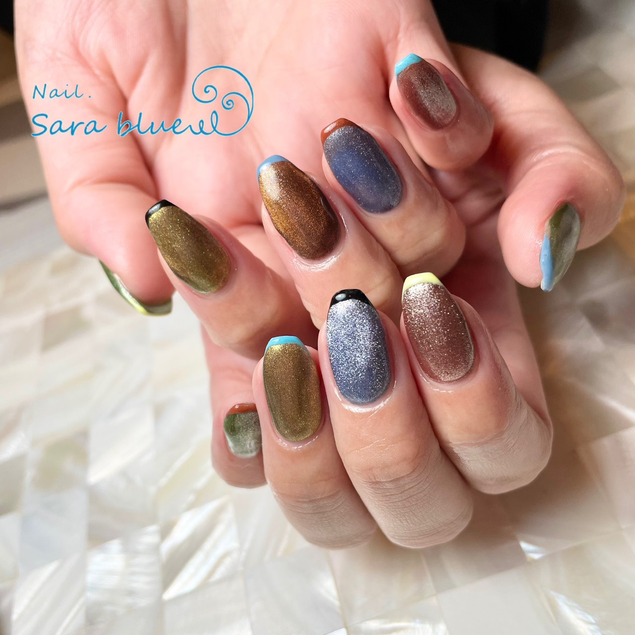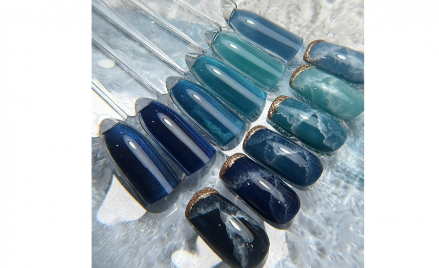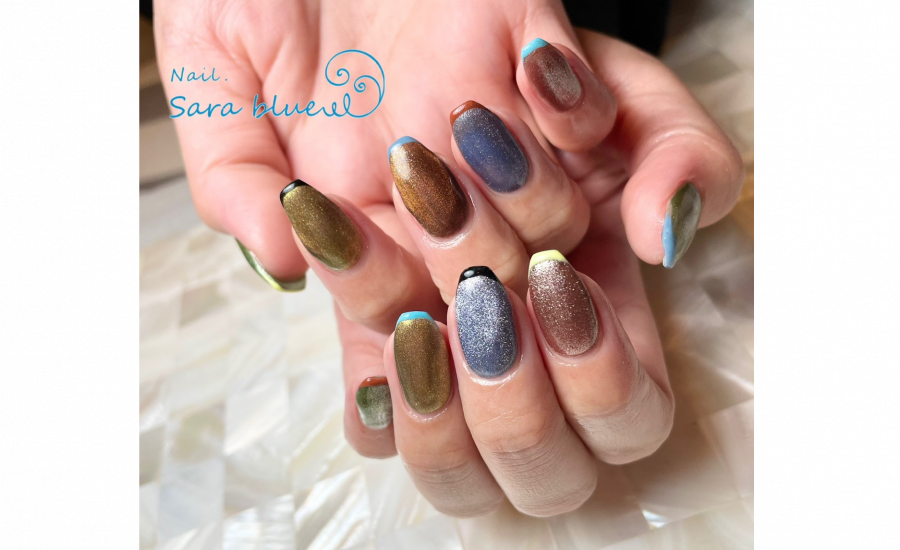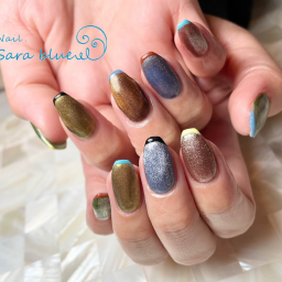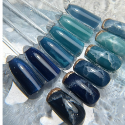 透明感のあるブルー、深みのあるマット、ちゅるんとしたニュアンスなど、写真でも伝わる“上品なのにどこか遊び心のある”デザインが魅力のサロンです♪青好きオーナーさんならではのブルー系アートはとくに美しく、指先を見るたびうれしくなる仕上がり。