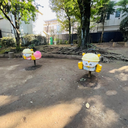 スプリング遊具は、豊島区制70周年を記念して誕生したキャラクター「としま ななまる」の形をしています。ふくろうの姿をした謎の生き物で、制帽をかぶりスモッグを着た幼稚園児スタイルがとても愛らしい存在。公園に遊びに来た子ども達に親しみやすいデザインになっています。にっこり笑顔で、園内に訪れた人を癒してくれますよ。スプリング遊具は2つ並んで設置されているので、きょうだいや友達と一緒に遊ぶのにもぴったりです。