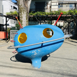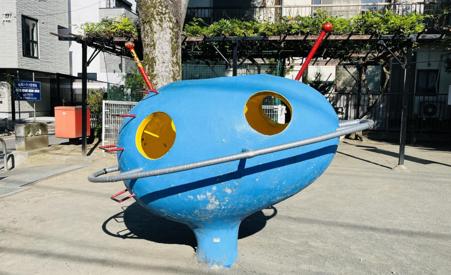 園内には一際目を引く遊具があります。その形はまるで地球に着陸したUFOのよう!赤いアンテナのようなものが2本ついており、面白い見た目になっています。子どもも見つけた途端、駆けよって行くかもしれません。手すりがついているので中に入ることもでき、穴から外をのぞくこともできます。