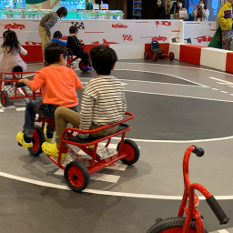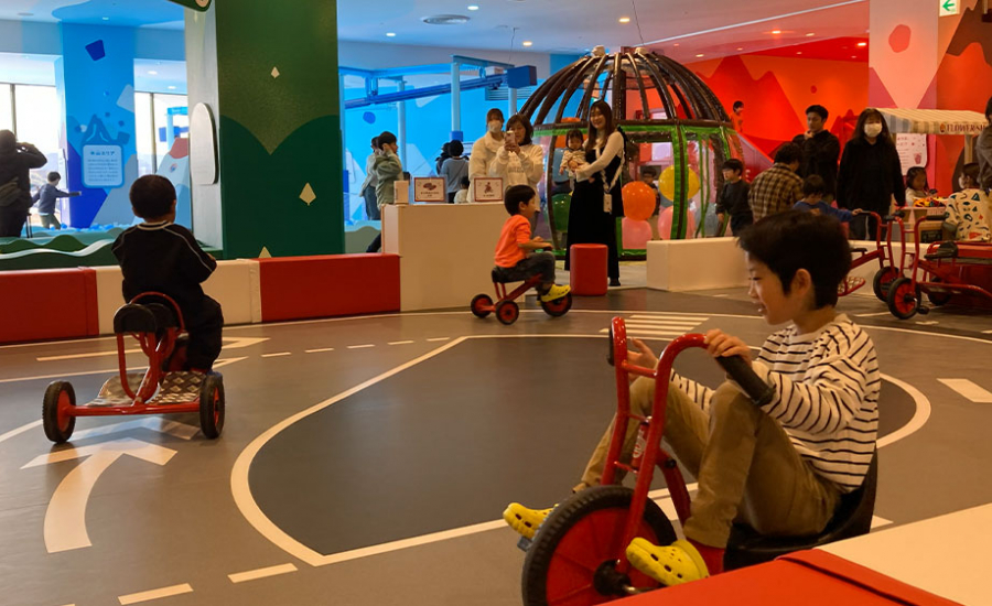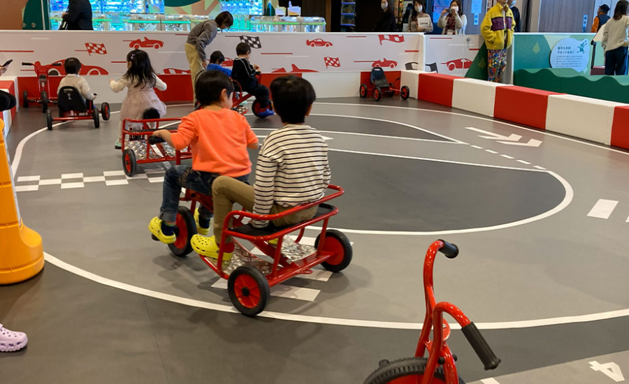 都市エリアにあるサーキットコーナーは三輪車やホイールライダーなどの乗り物が楽しめます。石川県の店舗ではここイオンモール新小松店限定!こども達にも大人気コーナーとなっていますよ☆