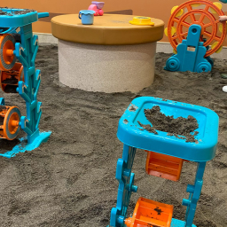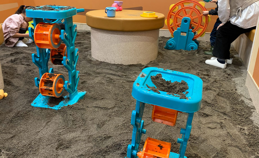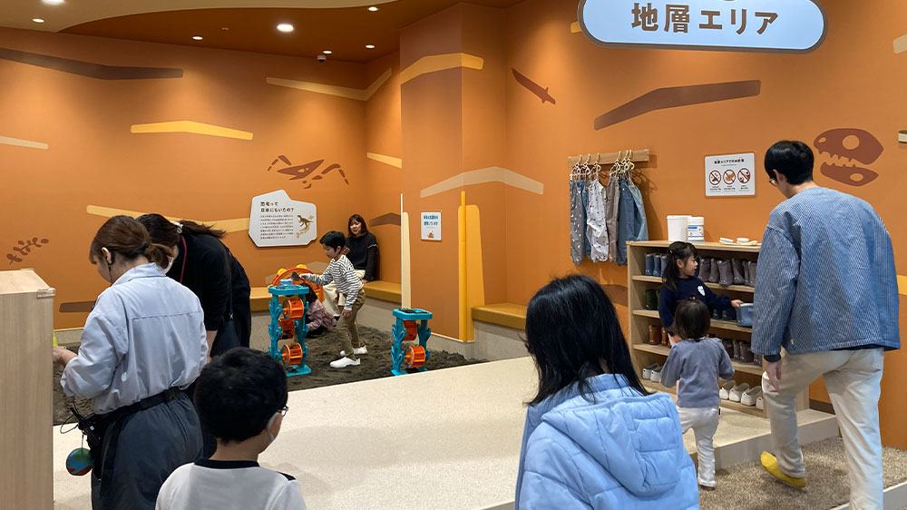 入ってすぐにある地層エリアでは、抗菌砂を利用した砂遊びが体験できます。準備や汚れが…と大人が躊躇してしまいがちな砂遊びですが、ここでは専用の長靴やつなぎのカッパなどの貸し出しがあるので、準備や汚れを気にせずに遊べますよ♪