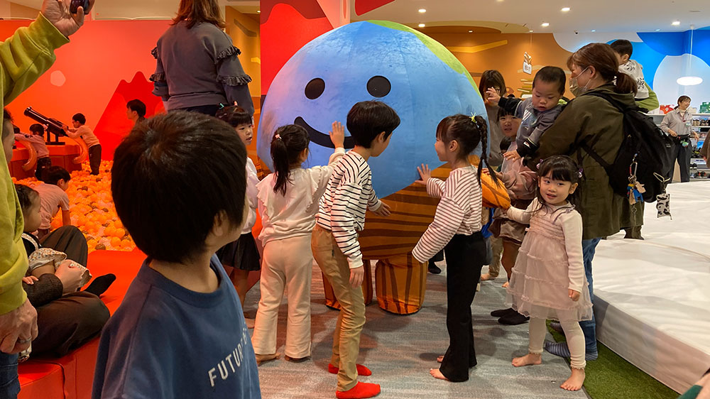 登場前にアナウンスが入るとまたたく間に、子ども達が集まってきます!スタッフの案内で子ども達は列になり順番に、ちきゅうくんとのふれあいタイム♡館内アナウンスにてお知らせされるので、ぜひ聞き逃しのないように。