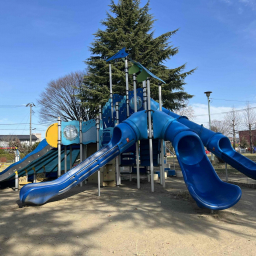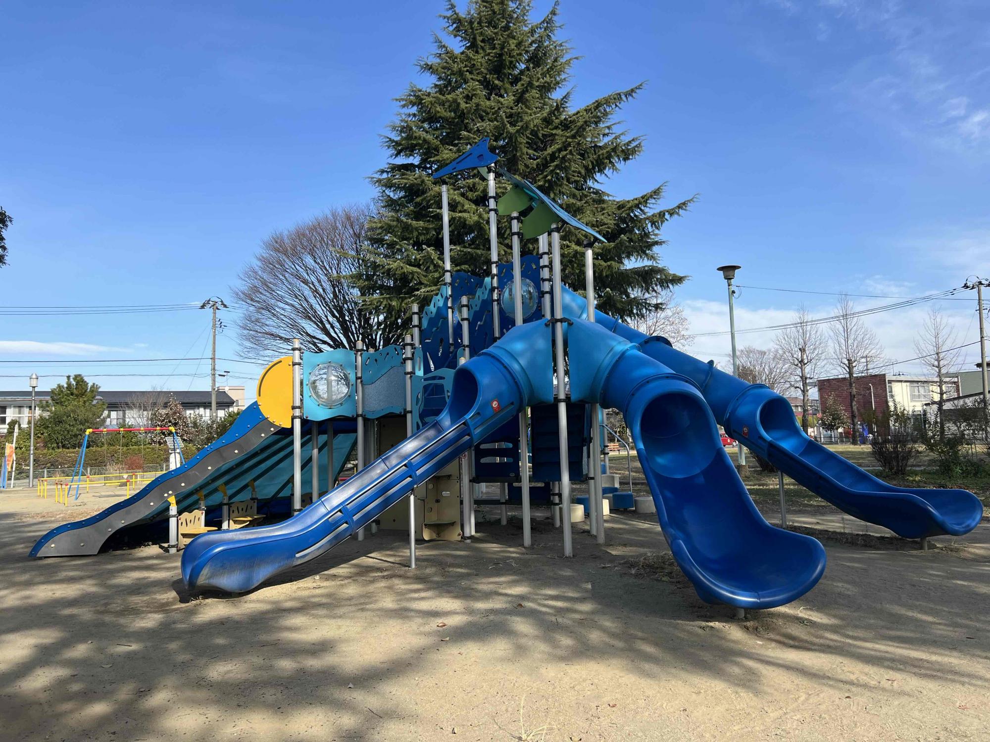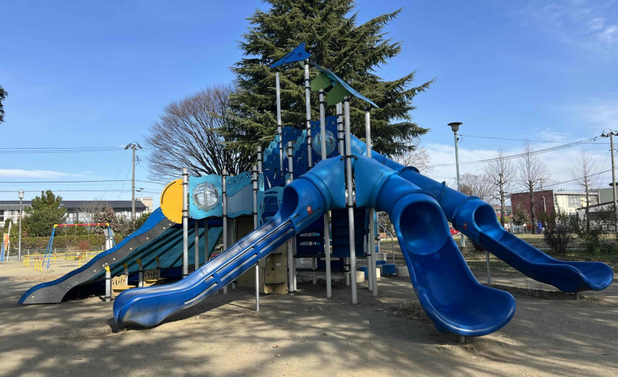 大島東公園は、郡山市桑野に位置する地域に親しまれている公園で、広場や遊具が整備され、子どもから大人まで幅広く楽しめる憩いの場です。シンボルとなっているのは鮮やかなブルーが印象的な大型複合遊具。傾斜や形が違うすべり台が複数あり、次はどれにしようかな?と考えながら何度でも楽しむことができます。