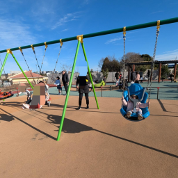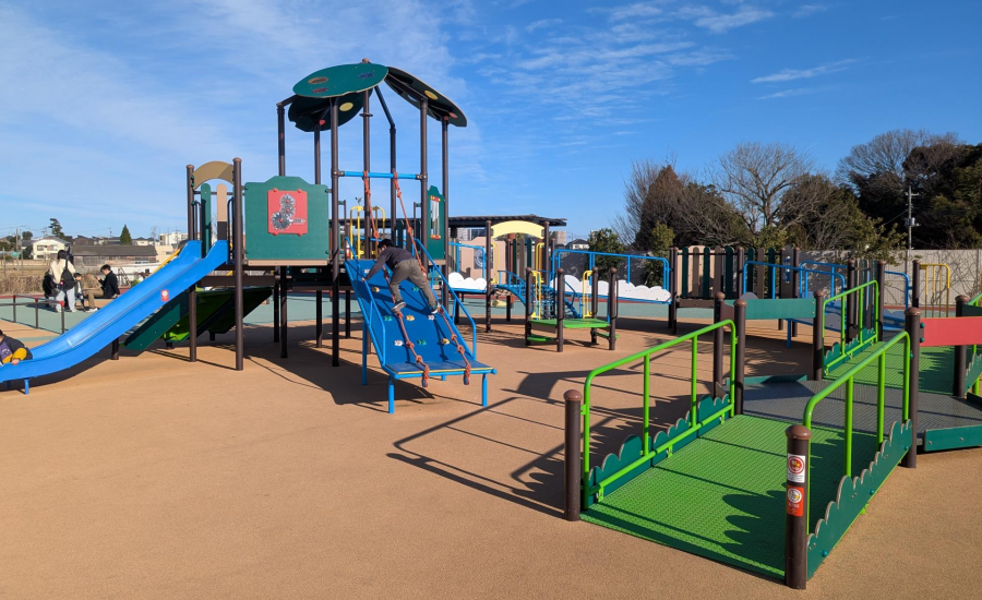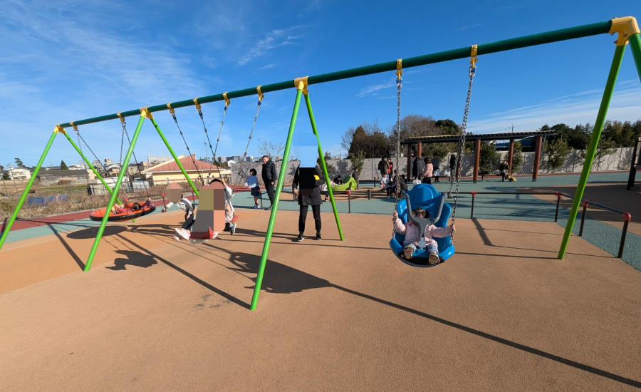 園内には最新のインクルーシブ遊具も揃っています。インクルーシブ遊具とは、障害や年齢に関わらずみんなが楽しく遊べる遊具のこと。車いすのまま登れるスロープタイプのコンビネーション遊具や、寝転がって乗れるブランコ、座って乗れる回転遊具もあり、ちびっこも安心して遊ばせてあげることができます。