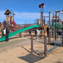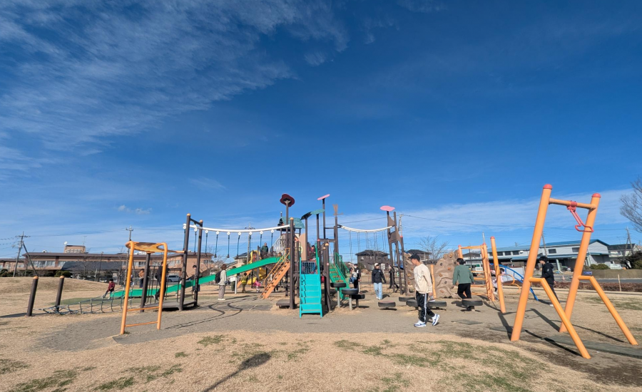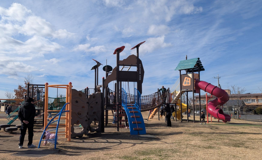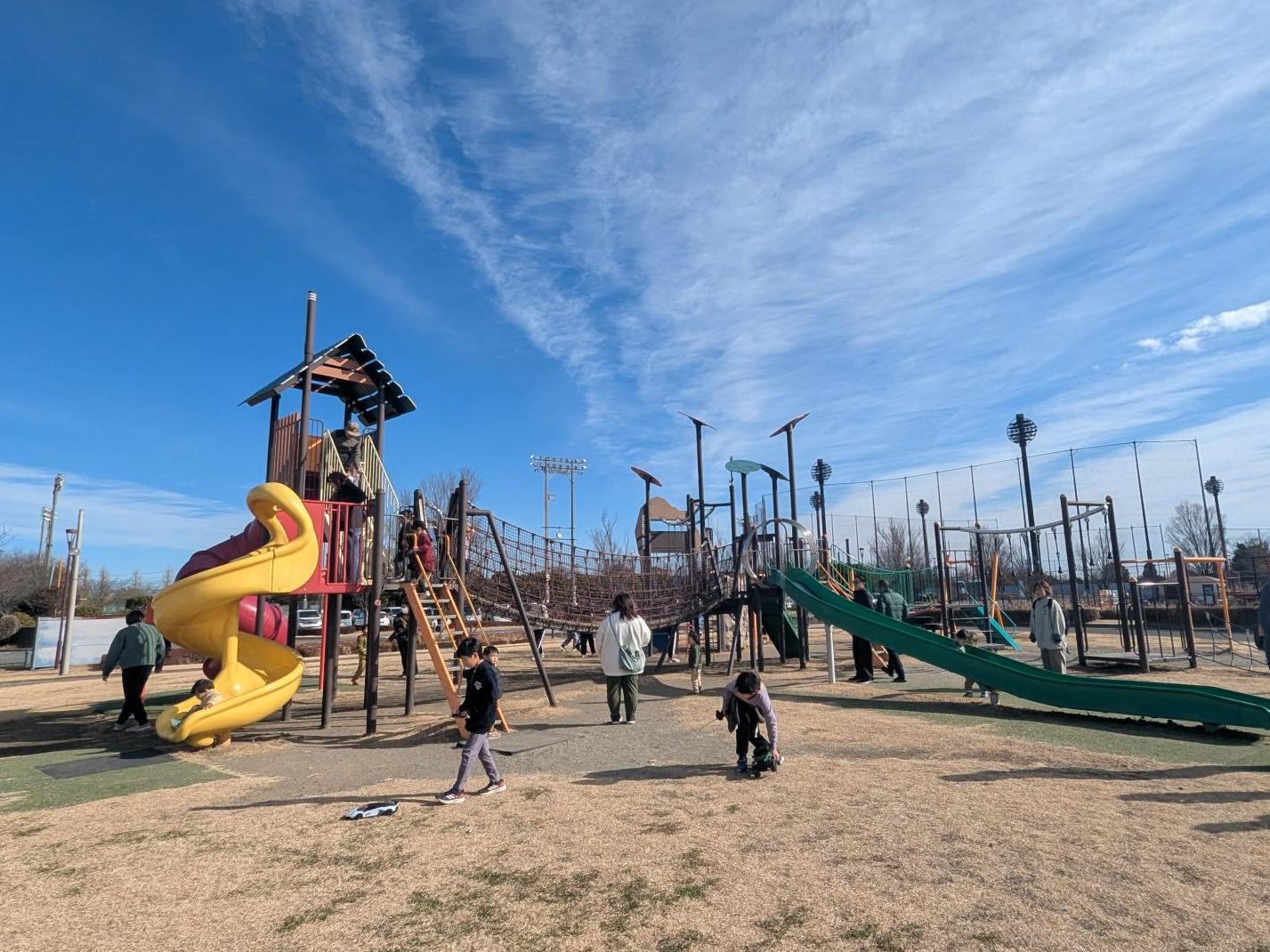 野球場やテニスコートなどの運動施設が揃う、東西に広い上谷総合公園。子ども達に人気の遊具エリアは西側の駐車場すぐ横にあります。