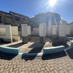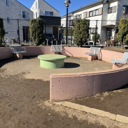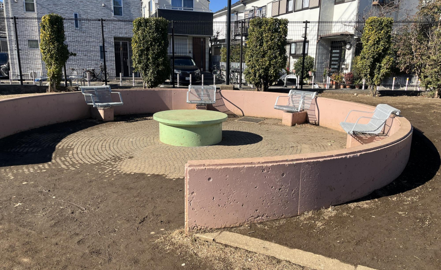 ガラクタ公園は外から見ても広々としており、子どもたちが思いきり走り回れる開放的な空間が広がっています。遊具がない分、周囲を気にせず体を動かせるため、自由にのびのびと遊べるのが特長です。園内の円形スペースにはイスが4つと黄緑色の丸いテーブルが設置されており、親子で休憩したりおやつを食べたりするのにぴったり。まるでコーヒーカップに乗っているような楽しい気分も味わえます。壁はピンクに塗られた部分が多く、全体的に可愛らしく明るい印象。写真映えもするため、思い出づくりにも。親子で心地よい時間を過ごせる公園です。