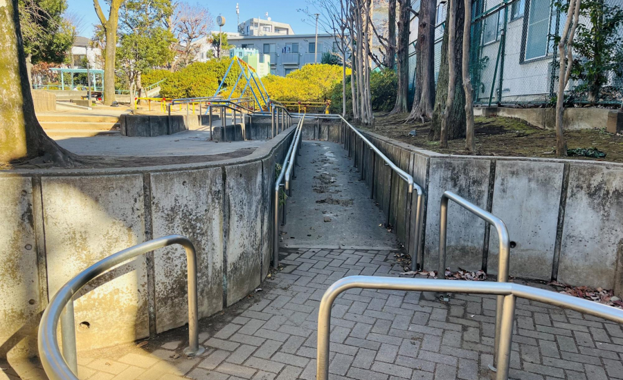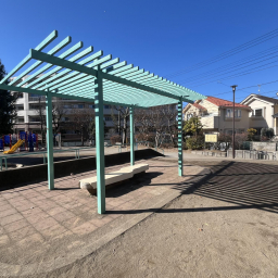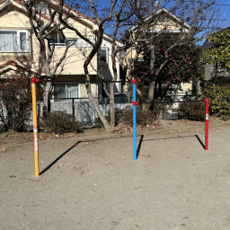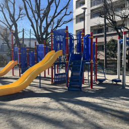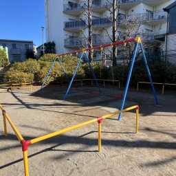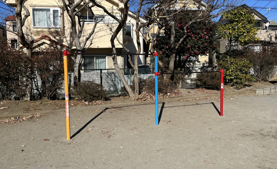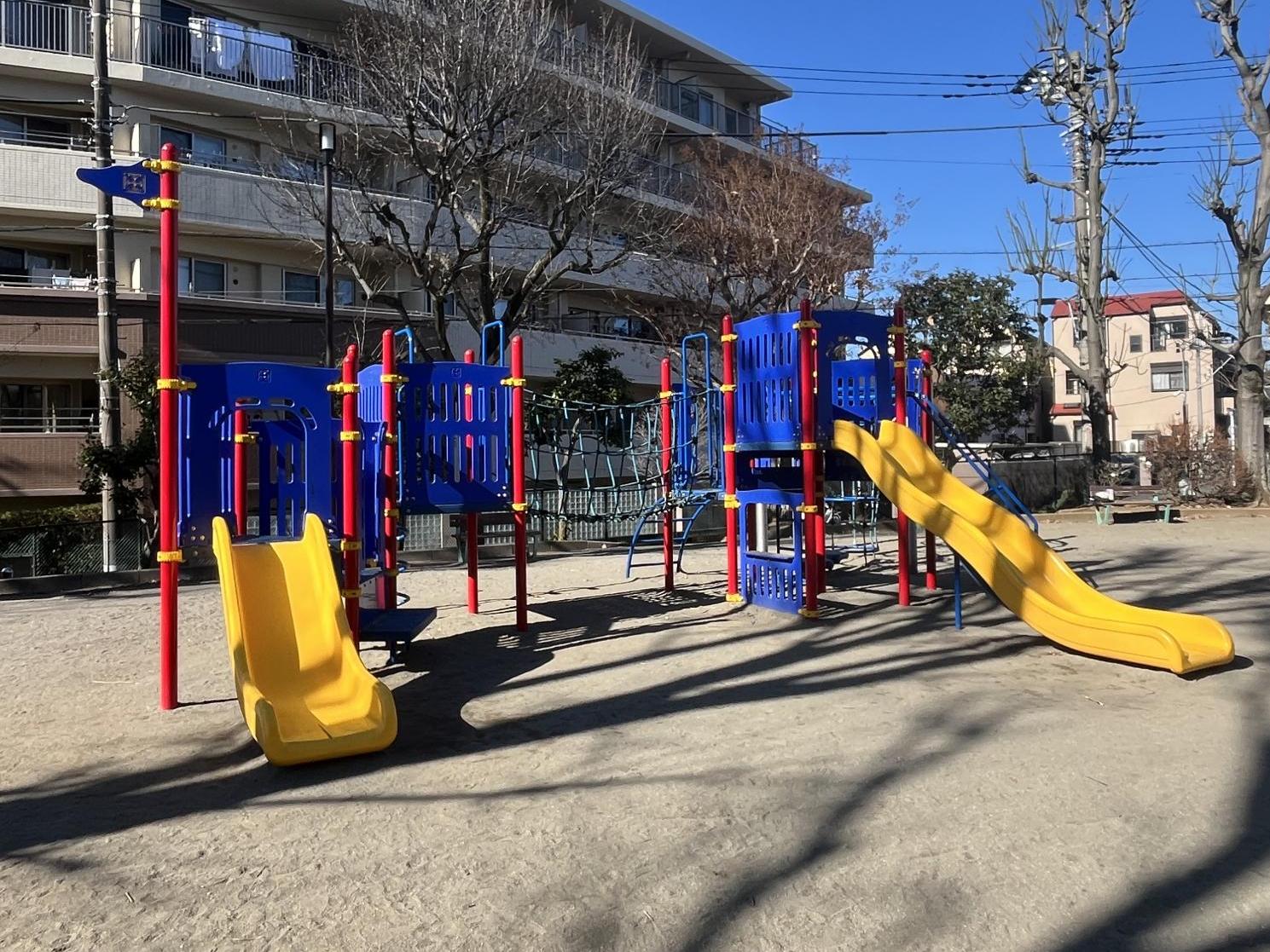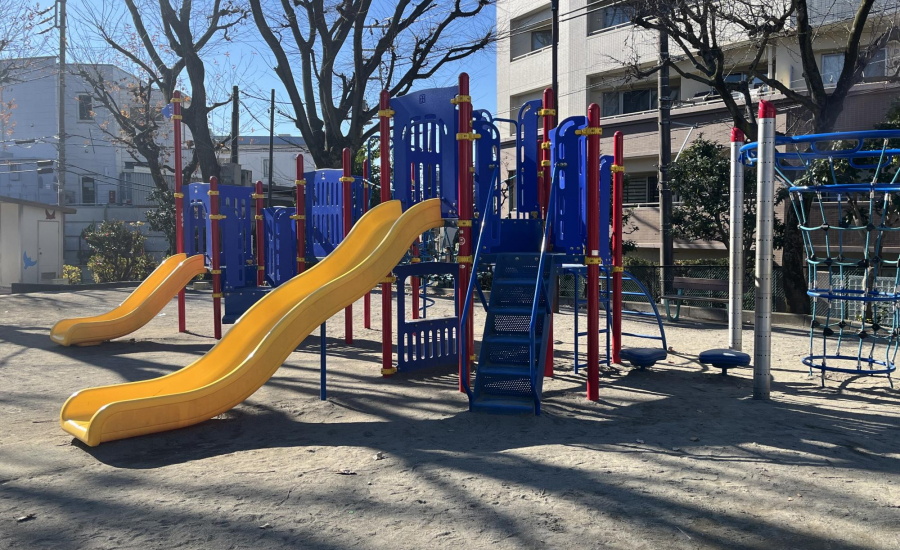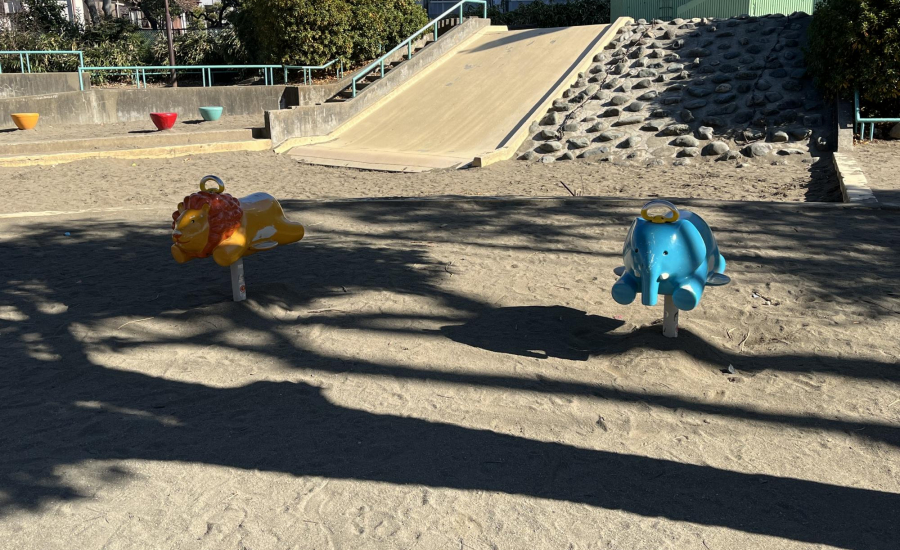起伏のある土地をうまく利用した貫井公園は、入口が緩やかなスロープになっており、ベビーカーでも入りやすい設計です。園内に設置されたシグナルカラーを取り入れた複合遊具は、遠くからでも目を引き、公園のシンボル的存在。中央付近にはネットの橋がかかっており、渡るときのドキドキ感がたまりません。子どもたちの楽しさを一層高めてくれます。2つあるすべり台は高さが異なり、子どもの成長や気分に合わせて選べます。そのほか、ライオンやゾウのスプリング遊具、鉄棒もあり、幅広い年齢の子どもが体を動かして楽しめる公園ですよ。