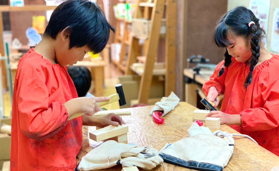 3つ目の木工エリアでは、トンカチを使って釘を打つ体験やノコギリで木材を切ることができます。慎重さや丁寧さが試されますね。