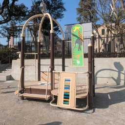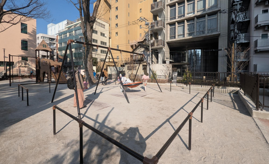広い園内には遊具が点在していて、全身を使って遊べるコンビネーション遊具や、インクルーシブ遊具のブランコも!