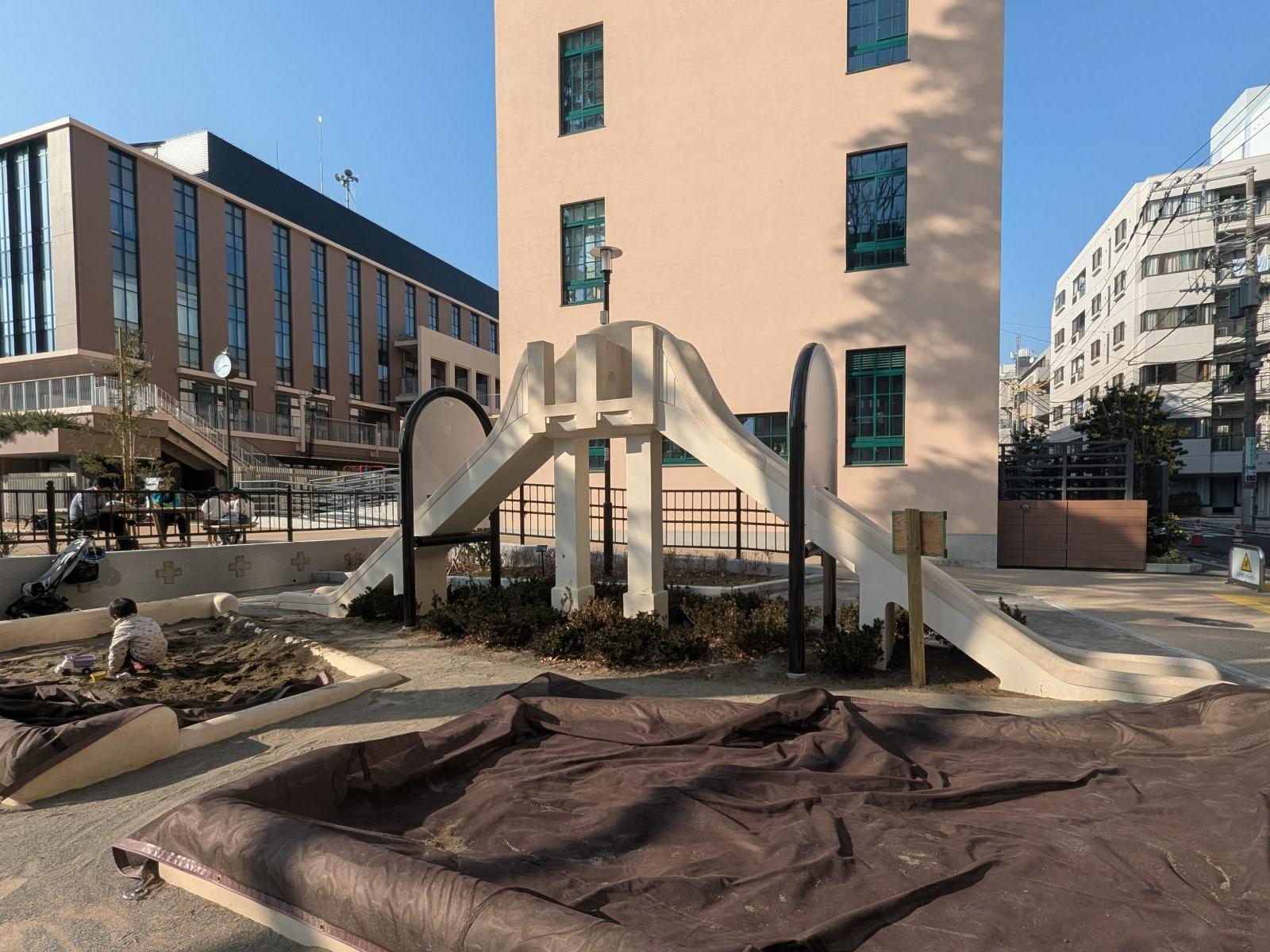 歴史ある元町公園は、リニューアルしても開園当初からある砂場と石製の重厚感のある二股滑り台がシンボルです。残念ながら滑り台は老朽化のため現在は遊ぶことができませんが、その姿をしっかりと残し、今も子ども達を見守っています。また、足元の砂場は完全再現されていて、広い砂場で遊ぶことができますよ♪